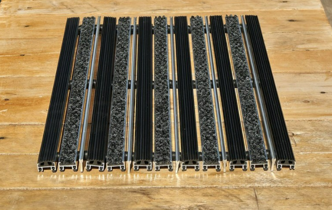 Придверная решетка Gidrolica Step резина+текстиль+скребок 390х590 мм выполнена из высокопрочных алюминиевых профилей, дополнительно оснащенных очищающими вставками (резиновыми, текстильными, скребковыми). В качестве крепежей используются стальные оцинкованные тросы с амортизирующими уплотнителями. Эти амортизаторы обеспечивают стабильные зазоры 3-6 мм между рабочими перемычками. Такие параметры позволяют эффективно собрать мелкий и средний мусор.