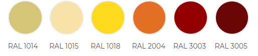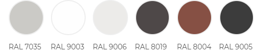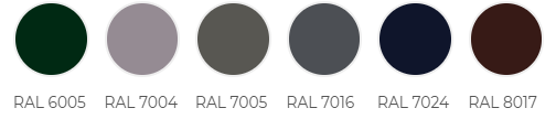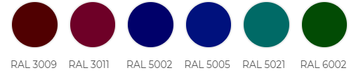 1014, 1015, 1018, 2004, 3003, 3005, 3009, 3011, 5002, 5005, 5021, 6002, 6005, 6020, 7004, 7005, 7016, 7024, 7035, 8004, 8017, 8019, 9002, 9003, 9005, 9006![]() ![]() ![]() ![]()