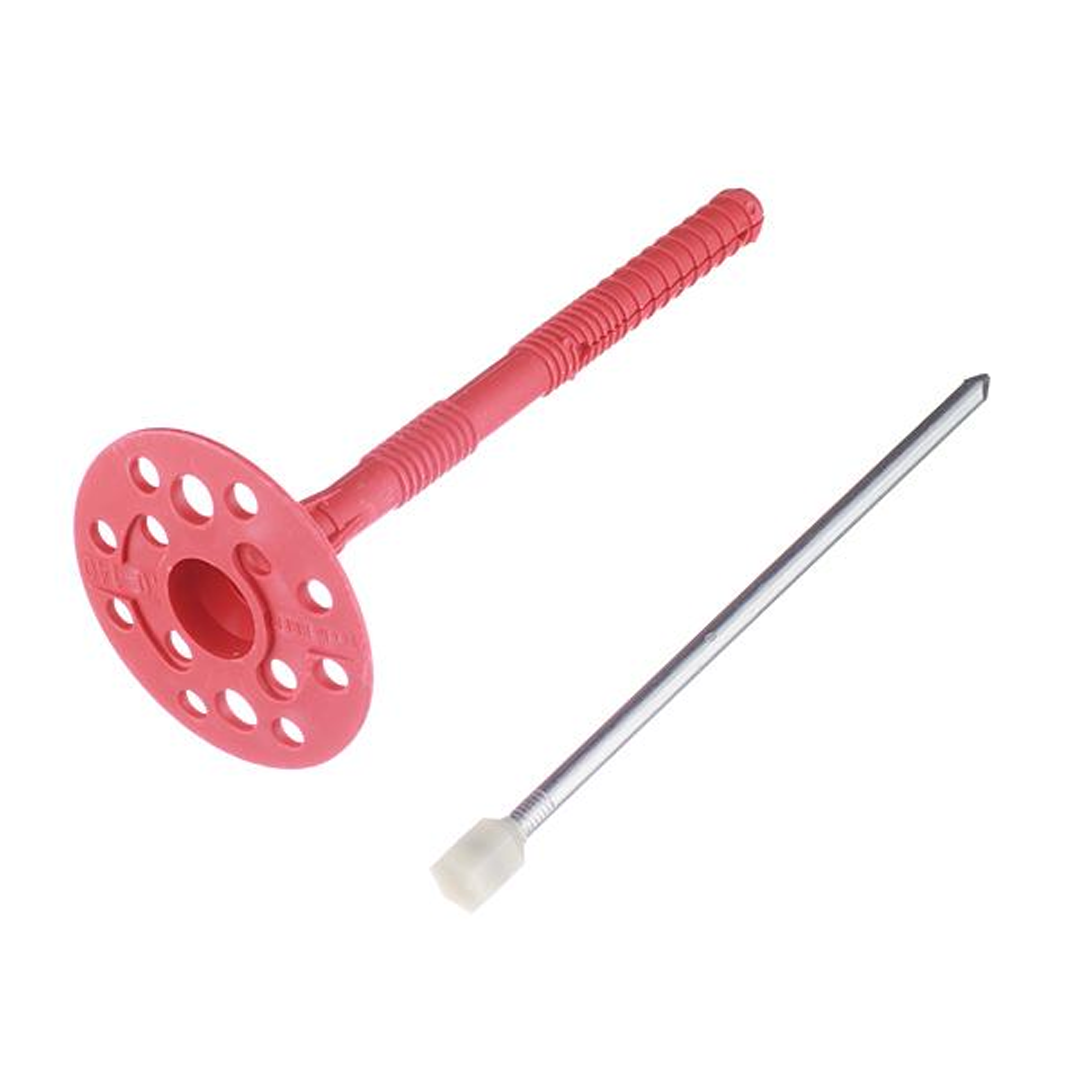 Дюбели предназначены для крепления к фасадам теплоизоляции - плит из минеральной и каменной ваты, пенополистирола, пенопласта и других. Дюбели имеют двухсекционную распорную зону и дополнительные лепестки расклинивания над распорной зоной. Широкая пластиковая шайба диаметром 60 мм и увеличенная голова распорного элемента (гвоздя) обеспечивает легкий монтаж изоляционных материалов к основанию. Такой вид крепежа подходит для оснований из ячеистого бетона, монолитного бетона и кирпича. Применяется в многоэтажном строительстве, т.к. металлический гвоздь, по сравнению с пластиковым, выдерживает увеличенные нагрузки. Увеличенная несущая способность позволяет наносить более плотный штукатурный слой и монтировать тяжелые облицовочные материалы поверх теплоизоляциии. Термоголовка необходима для того, чтобы предотвратить возникновение «мостиков холода», которые могут существенно сказаться на тепловой изоляции здания в целом. Таким образом, дюбель для бетона с гвоздем с термоголовкой помогает увеличить показатели защиты, предотвратить потери тепла и коррозию гвоздя