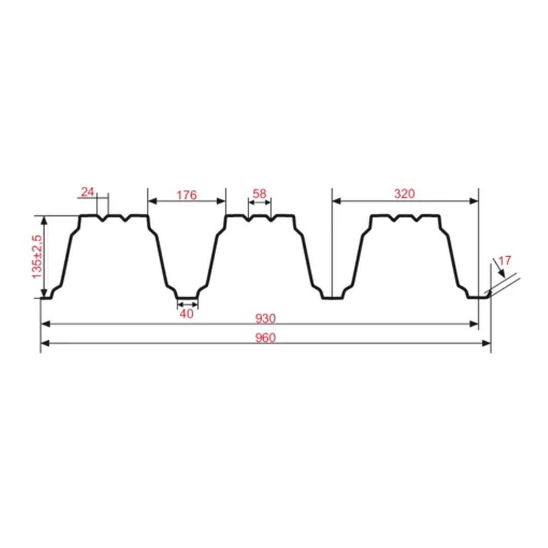 Профнастил Н135 – 930 используется для устройства плоской совмещенной кровли, организации несущих конструкций, элементов быстровозводимых зданий, перекрытий, диафрагм жесткости и в качестве несъёмной опалубки при устройстве железобетонных перекрытий. Длина листов профнастила – под заказ от 0,5 до 14,0м.