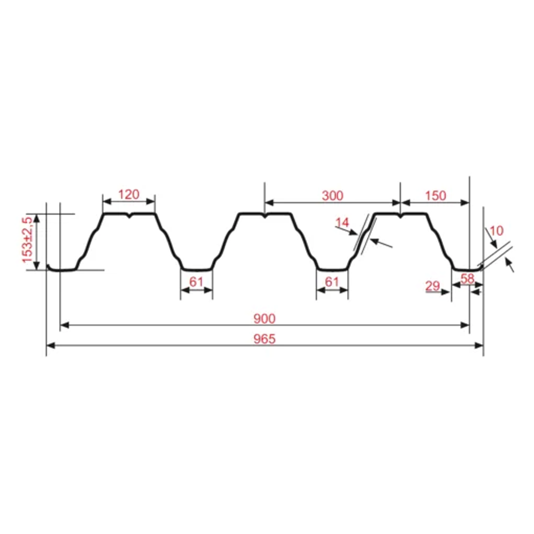 Профнастил Н153 – 900 используется для устройства плоской совмещенной кровли, организации несущих конструкций, элементов быстровозводимых зданий, перекрытий, диафрагм жесткости и в качестве несъёмной опалубки при устройстве железобетонных перекрытий. Длина листов профнастила – под заказ от 0,5 до 14,0м.