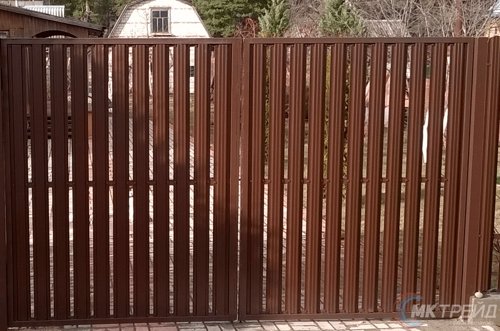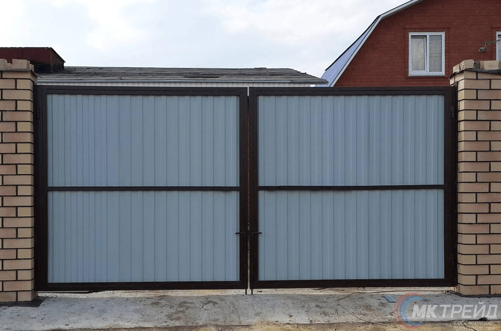 Каркас створки распашных ворот изготовлен из стальной трубы с полимерной покраской. Внутри рамки приварена внутренняя рамка из трубы меньшего размера, на которую происходит крепление металлического штакетника или профнастила.