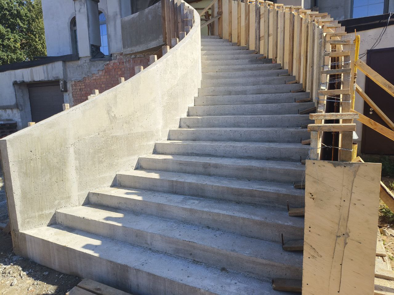 Бетонную лестницу производят в три этапа. Сначала собирают опалубку, которая придает изделию нужную форму. В нее укладывают арматуру, за счет чего готовое изделие будет прочнее. Затем заливают бетон, и он принимает запланированную форму, застывает в течение определенного времени. Далее идут отделочные работы соответственно пожеланиям заказчика.
