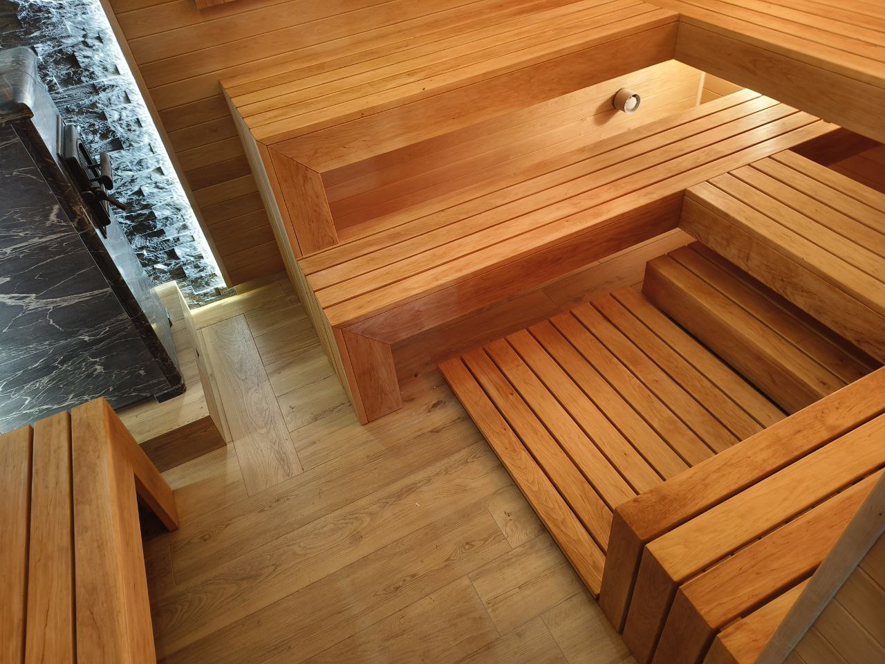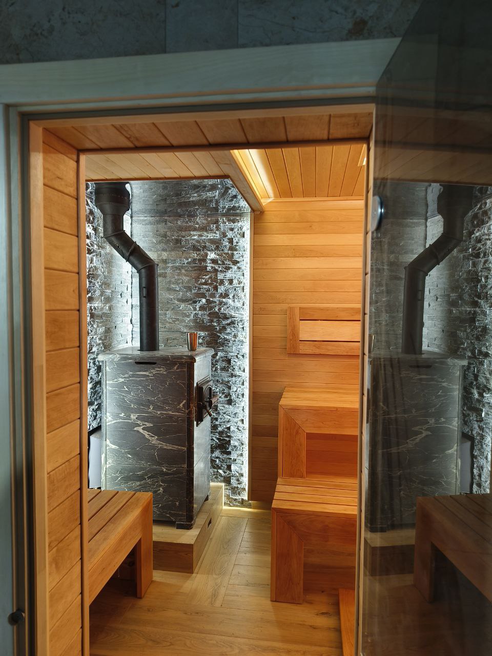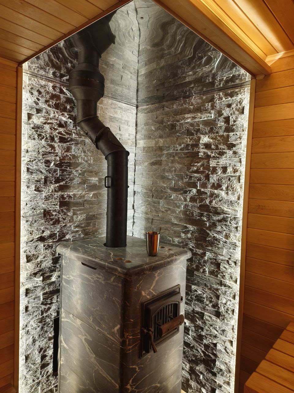 Камень - идеально подходит для создания более современного и элегантного дизайна. Благодаря своим теплоотражающим свойствам, камень помогает эффективно сохранять тепло в парной.